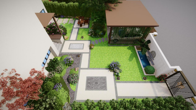 緊密處不顯擁擠,而開敞處一覽無余,本案對(duì)留白和節(jié)奏的把控十分嚴(yán)謹(jǐn),前院廊架旁植物規(guī)律種植,而草坪處不設(shè)多余景觀小品;后院植物組團(tuán)處高低、季相變化明顯,而觀景點(diǎn)周圍亦不設(shè)其余節(jié)點(diǎn),由此突出景觀主題,使新中式庭院設(shè)計(jì)簡單、安閑的概念更加清晰明了,同時(shí)也使得整個(gè)庭院簡約大氣,顯露亦古亦今的美。