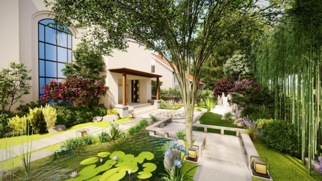 江南水鄉(xiāng)之美,美在小橋流水人家的安靜中攜著溫柔;美在于庭院里漫步,愜意十足......本案于后院設(shè)小橋流水、荷花水池,曲徑通幽處便是茂密園林,豁然開朗而又置身世外,韻味悠長,雅致舒適,將自己與自然融為一體,陶冶與自然的閑適心情。